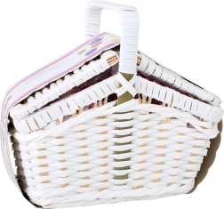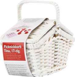 A fehér fonott kosár tárolási lehetőséget nyújt a teljes készlet számára, miközben erős szerkezete és dekoratív elemei autentikus piknik érzést adnak.