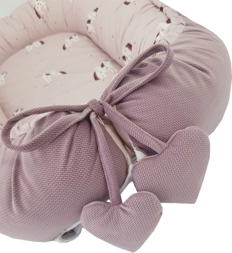A puha és biztonságos babafészek kényelmet, megemelt peremmel nyújtott támaszt és kellemes környezetet a pihenéshez és alváshoz biztosít. A pamut és a selymesen puha velvet kombinációja kíméletes az érzékeny bőrhöz, míg a praktikus zsinóros összehúzás lehetővé teszi a fekhely szorosságának beállítását. Remek alternatíva a takarók és pólyák helyett, és játszóalátétként is használható.
