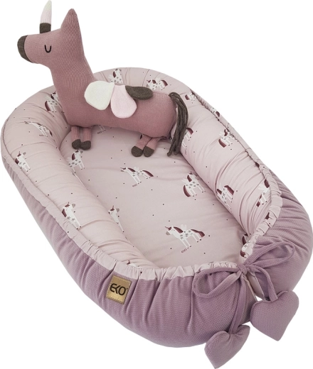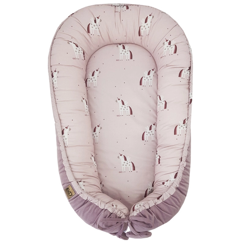 Az univerzális Eko Unicorn 90 × 60 cm-es babafészek otthon és útközben is meghitt, védett helyet teremt a babának. A magas, puhán párnázott peremek segítenek a gyermek stabil helyzetének megtartásában, és megkönnyítik az oldalra fektetést, ami különösen hasznos reflux esetén. A belső, puha pamut és a külső, lágy velvet maximális kényelmet és meleget biztosít.