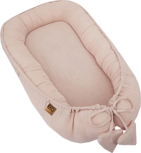 Muszlin babafészek finom Powder Pink árnyalatban, amely biztonságos és meghitt környezetet nyújt alváshoz és pihenéshez. A magas peremek segítenek oldalfekvésben tartani a babát, ami hasznos például reflux esetén. Sokoldalúpuha játszóalátétként is használható. 100% pamutból készült, hipoallergén töltettel az érzékeny bababőr számára.