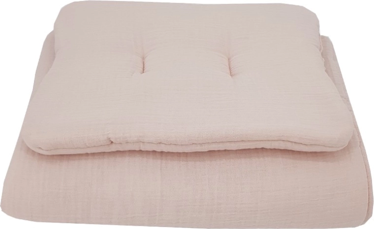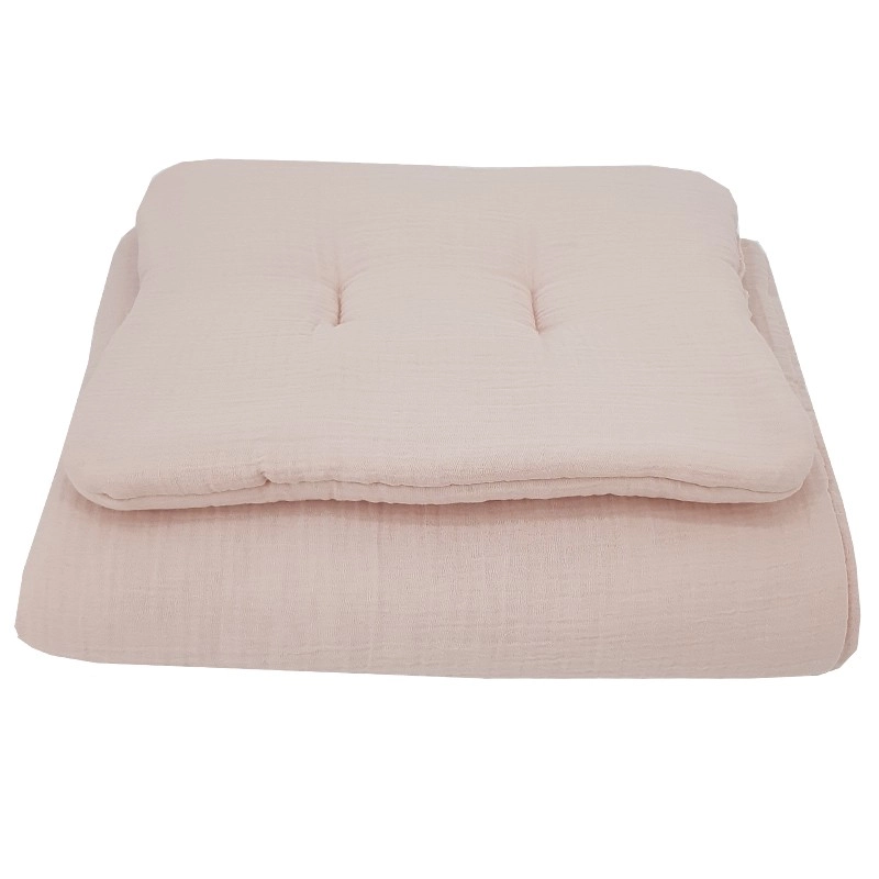 Biztosíts nyugodt alvást a babának ezzel a 2 részes muszlin ágyneműszettel a finom powder pink árnyalatban. A könnyű és légáteresztő 100% pamut muszlin rendkívül puha tapintású, rugalmas és kíméletes az érzékeny bőrhöz. A szett egy 30 × 40 cm-es párnából és egy 75 × 100 cm-es takaróból áll, hipoallergén töltettel a kényelmes és biztonságos alváshoz.