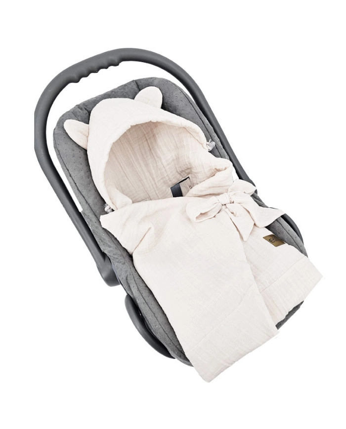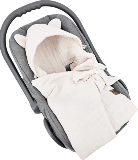 A bájos fülecskékkel ellátott kapucni véd a hidegtől, míg a masnis pólyázó kialakítás megakadályozza a lecsúszást, szemben a hagyományos takarókkal. A kifinomult Beige árnyalat könnyen harmonizál a babafelszereléssel és az autó belterével, a 110 × 100 cm-es méret pedig elegendő teret ad a nagyobb babák pólyázásához is.