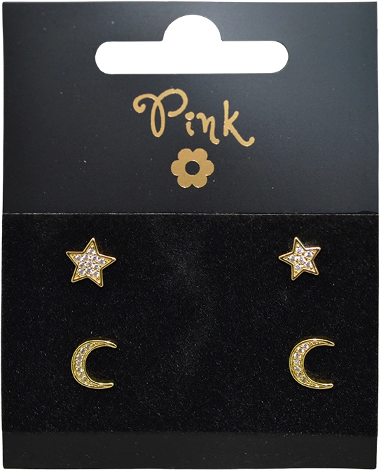 Négy aranyozott fülbevaló szettje ötvözi az éjszakai égbolt varázsát a modern letisztultsággal. Az egyik párt elegáns holdsarló, a másikat finom, ötcikkelyű csillag díszíti. A csiszolt kristályok csillogást kölcsönöznek, amely minden mozdulatnál érvényesül, míg a meleg aranyozott árnyalat kiemeli a luxusos megjelenést.