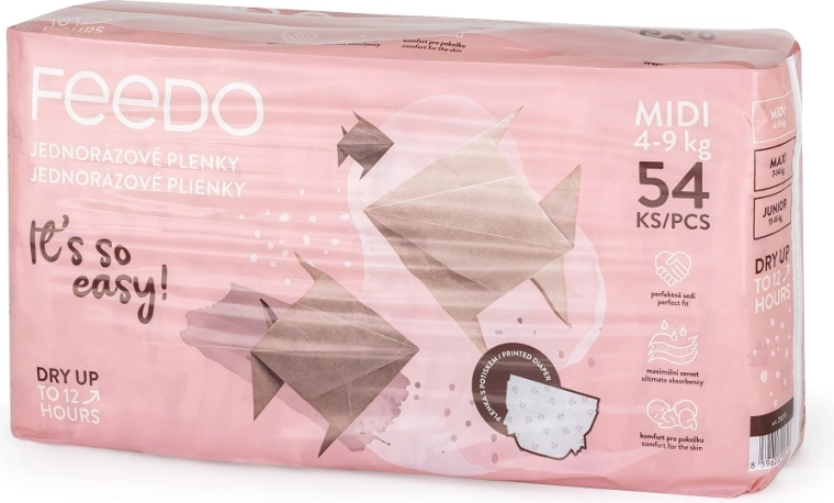 A FEEDO Midi pelenkákat a babák és a szülők mindennapi kényelmére tervezték. A háromrétegű nedvszívó mag azonnali száraz érzetet és megbízható védelmet nyújt nappal és éjjel egyaránt. A légáteresztő kialakítás elősegíti a levegő áramlását, és hozzájárul a egészséges, irritációmentes bőrhöz.