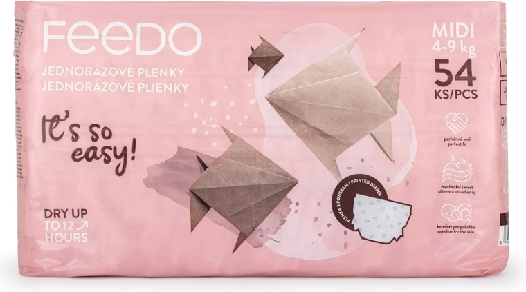Az eldobható FEEDO Midi 3 (4–9 kg) baba pelenkák akár 12 órás védelmet, gyors nedvszívást és légáteresztő anyagokat biztosítanak, amelyek kíméletesek az érzékeny bőrhöz. A rugalmas mandzsettáknak és a többször visszazárható tépőzárnak köszönhetően tökéletesen illeszkednek, nem akadályozzák a mozgást és minimalizálják az átszivárgás kockázatát.