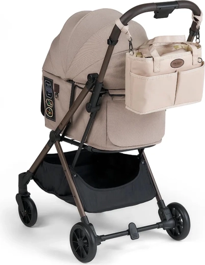 A rendezőt úgy tervezték, hogy a legtöbb babakocsihoz passzoljon, stabil formája pedig menet közben is áttekinthetően tartja a tartalmat. A bézs kivitel könnyen illeszthető különféle babakocsi-stílusokhoz, és a minőségi anyagoknak köszönhetően egyszerűen tisztán tartható.