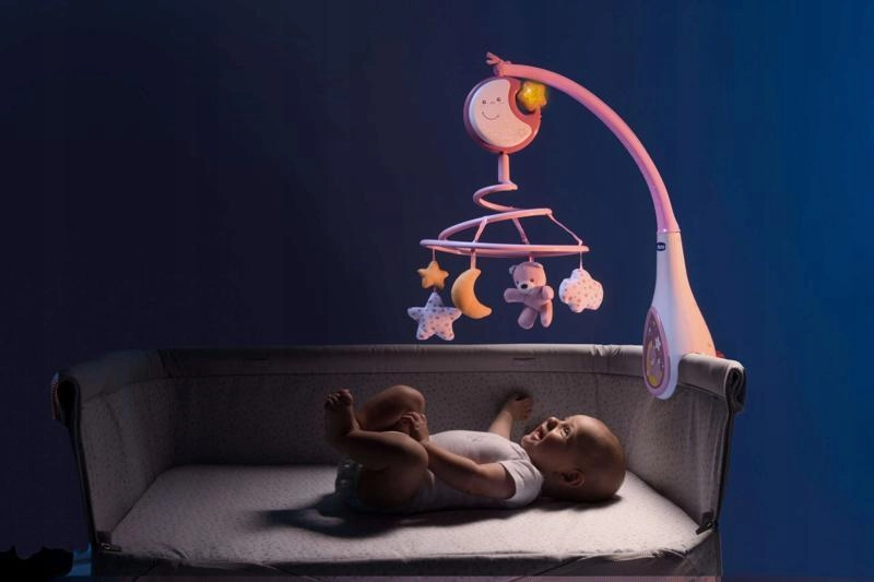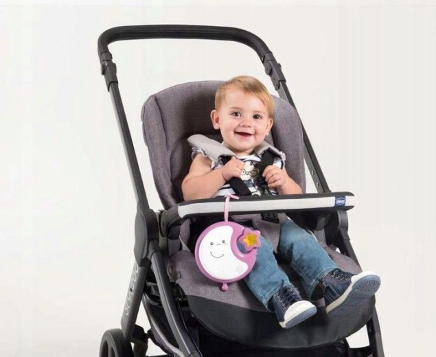A levehető elektronikus egységnek köszönhetően, amely holdszerű fényt ad, a termék a kiságyon kívül is használható – könnyen felakasztható a kiságy oldalára, a babakocsira vagy az autósülés fogantyújára. A forgó spirál puha, hipoallergén textilekkel és négy lógó játékkal fejleszti a baba látását és fókuszát, és támogatja a nyugodt elalvást.