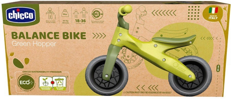 A Chicco Green Hopper Eco+ tökéletesen kiegyensúlyozott futóbicikli a legkisebbeknek, 18–36 hónapos korig. A letisztult kialakítás, a biztonságos markolatok és az alacsony átlépés megkönnyítik az első önálló gurulásokat. A széles, defektmentes kerekek egyenletes és biztonságos mozgást biztosítanak a sík felületeken.