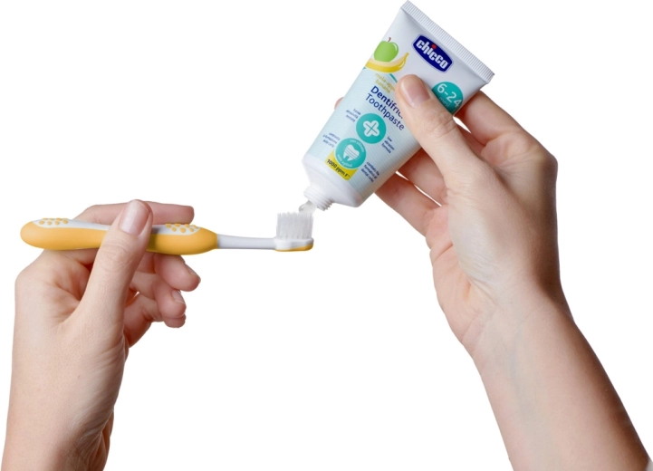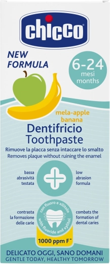Kímélő gyermek fogkrém CHICCO finom alma- és banánízzel, 6–24 hónapos gyermekek számára fejlesztve. A xilit tartalom segít megelőzni a fogszuvasodást, az alacsony abrazivitás kíméletes a tejfogakhoz, a fluorid pedig támogatja védelmüket. A praktikus 50 ml-es kiszerelés ideális a mindennapi ápoláshoz az első fogacskáktól kezdve.