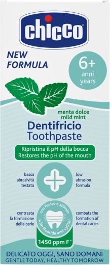 A Chicco gyermek fogkrém finom mentás ízzel kifejezetten 6 éves kortól készült. Nem abrazív összetétele kíméletesen ápolja a fogakat, és betainnal és E-vitaminnal dúsított az íny védelméért. A fluoridnak köszönhetően segít erősíteni a zománcot, a friss mentás-gyümölcsös íz pedig a növekvő gyerekek kedvence.