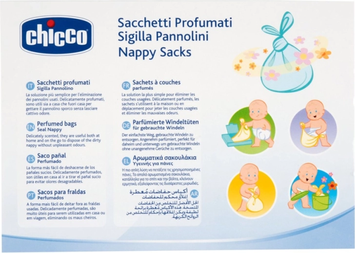 Viszlát, kellemetlen szagok a használt pelenkák kidobásakor. A CHICCO illatosított zacskók egyszerű módot kínálnak arra, hogy gyorsan és higiénikusan megszabaduljon a pelenkáktól anélkül, hogy a szagok szétterjednének a lakásban vagy az autóban. Csak helyezze be a pelenkát, zárja le, és dobja a kommunális hulladékba.