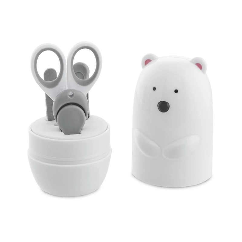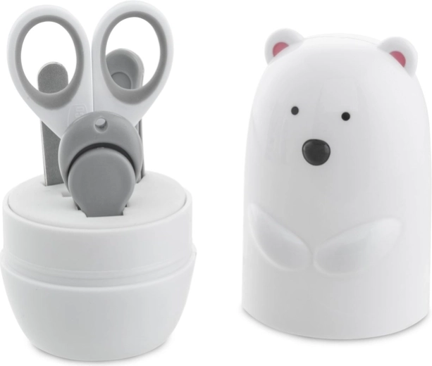 Praktikus 4 az 1-ben manikűrkészlet gyermekek körmének ápolásához, aranyos, jegesmedve alakú tokban. Tartalmaz mindent, ami a biztonságos és kíméletes körömvágáshoz és -formázáshoz szükséges újszülöttkortól: rozsdamentes acél ollót, 2 körömreszelőt, csúszásmentes körömvágót és csipeszt. Ideális babakelengyébe és utazáshoz is.