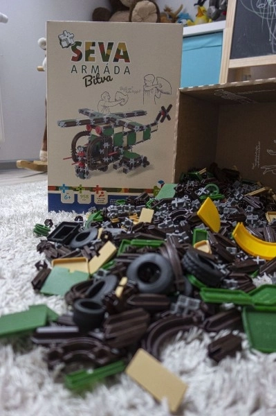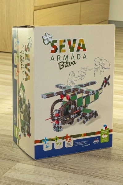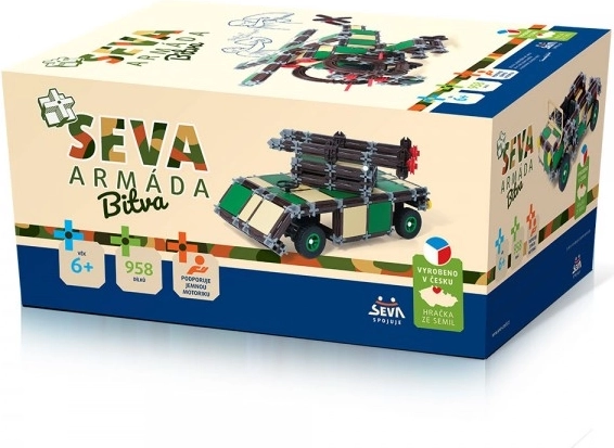 Fedezze fel a SEVA univerzális építőkészletét kis katonáknak és mérnököknek! A 958 darabból álló szett segítségével katonai autót, páncélozott szállítót, helikoptert és saját, egyedi modelleket építhet. Minden kompatibilis a többi SEVA készlettel, Csehországban készült, és ftalátmentes a EN71 szabvány szerint.