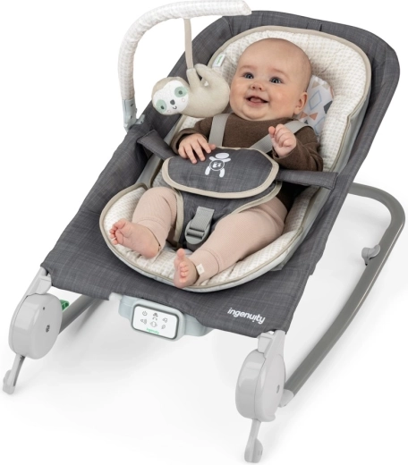 Az INGENUITY Happy Belly Rock-to-Bounce – Parker masszázs pihenőszék egyszerre nyugtat és szórakoztat. A körkörös mozgású integrált hengerek a finom ujjbegy-érintést utánozzák, és célzottan gondoskodnak az érzékeny pocakról. A masszázs egyetlen gombbal aktiválható, és 3 perc után automatikusan kikapcsol. A GentleTouch vezérlőpanellel könnyen választhatók a rezgések, a dallamok és a természet hangjai, hogy a baba elégedett legyen.