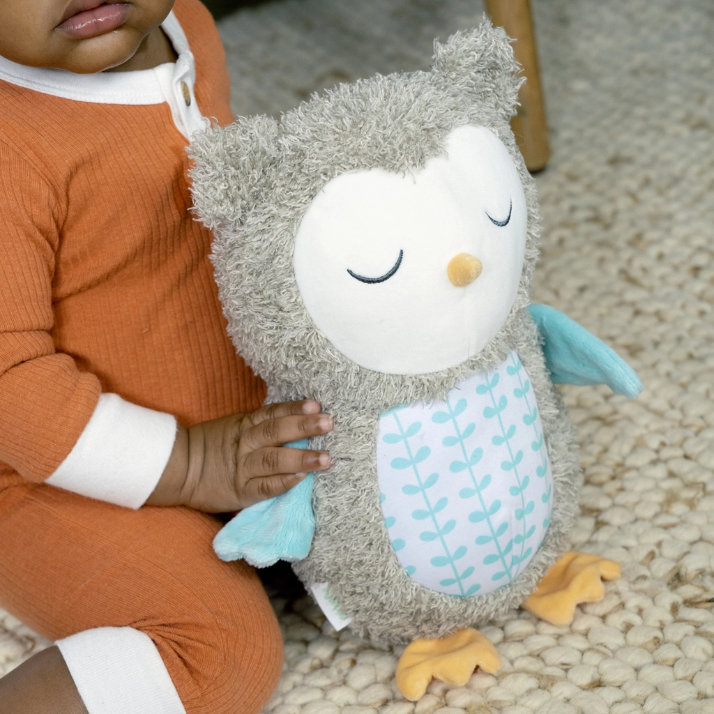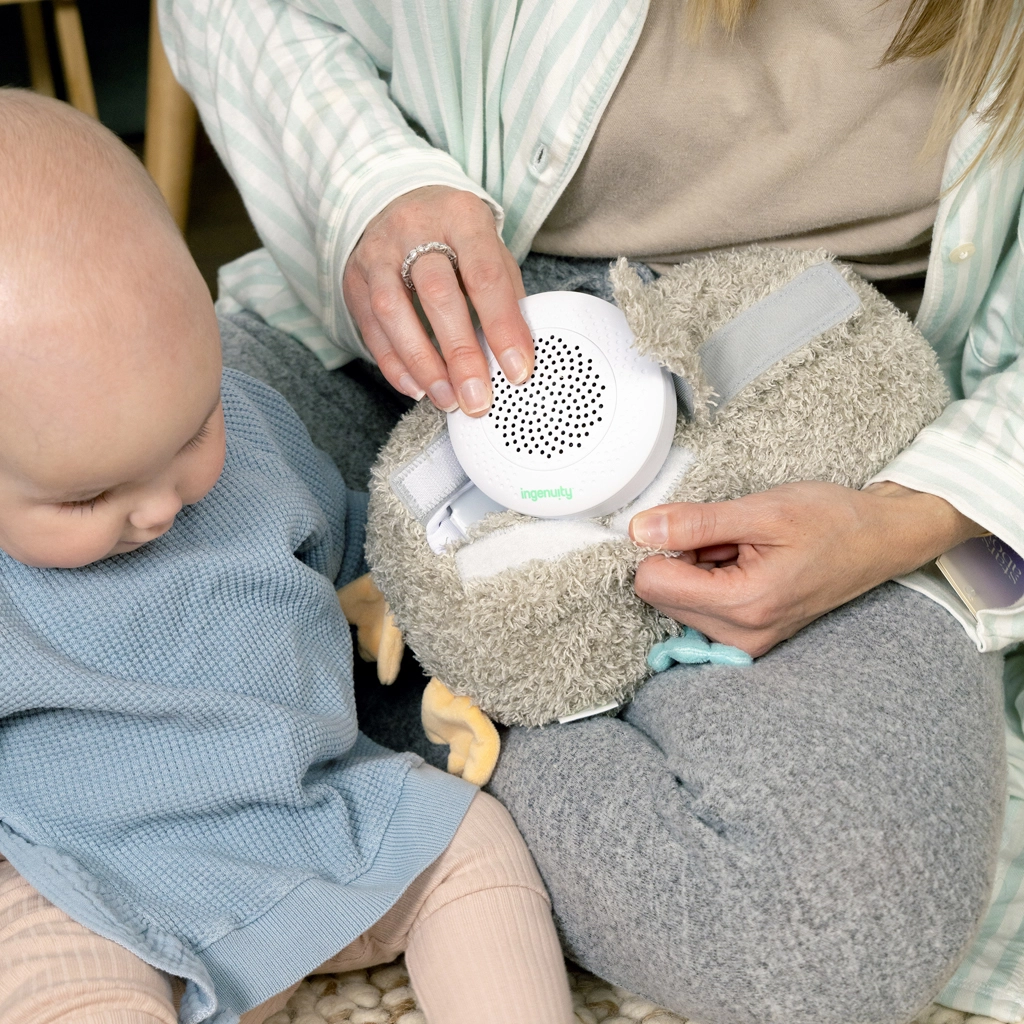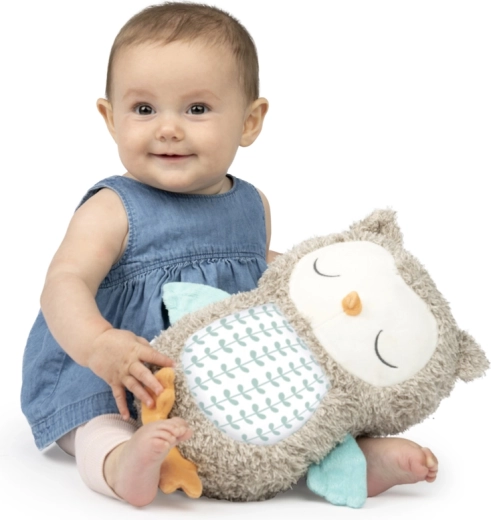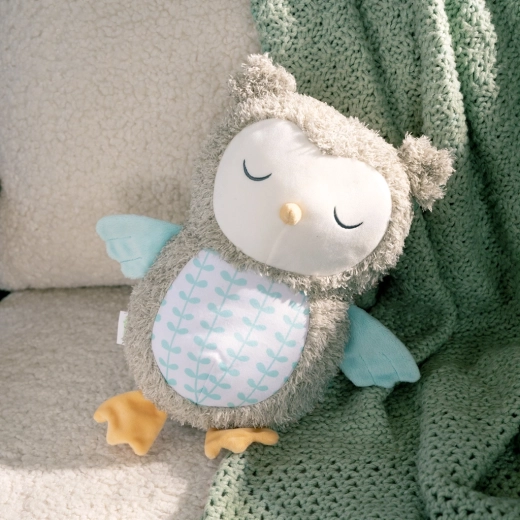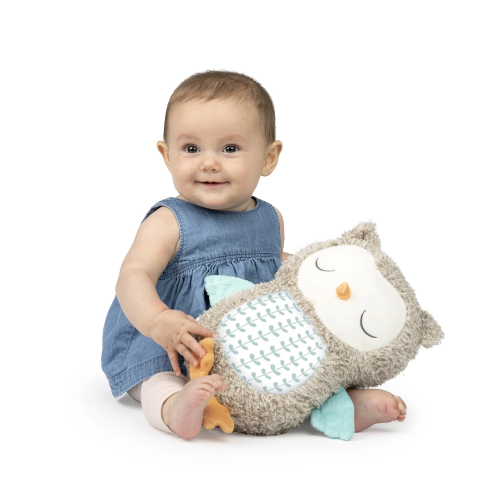 A Ingenuity Nally plüss bagoly bájos, puha barát és egyben megnyugtató alvástárs újszülött kortól. A hasába épített Bluetooth hangszóró altatódalokat és természet hangokat játszik le 30/60/90 perces időzítővel, amely után automatikusan kikapcsol. A bagoly biztonságos a legkisebbeknek (hímzett részletek), rácsos ágyhoz rögzíthető, a modult eltávolítva pedig könnyedén géppel mosható.
