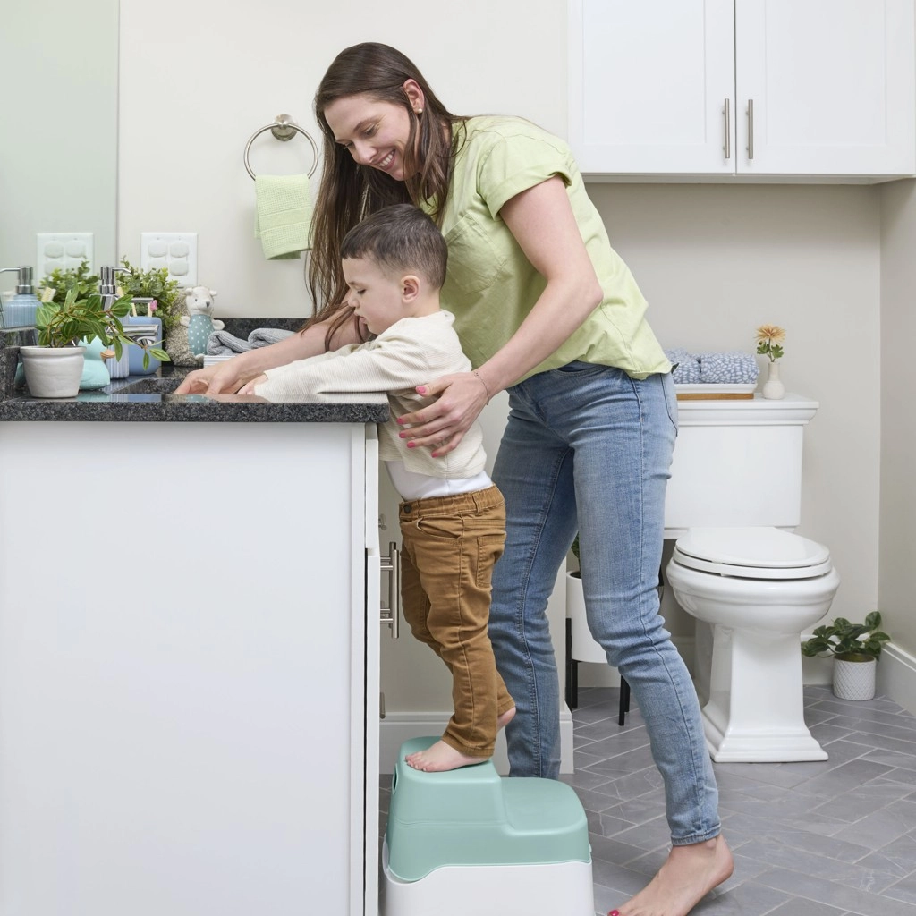 A stabil, kétlépcsős fellépő csúszásgátló felülettel segít, hogy a gyerekek biztonságosan elérjék a WC-t és a mosdót.