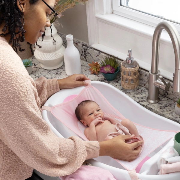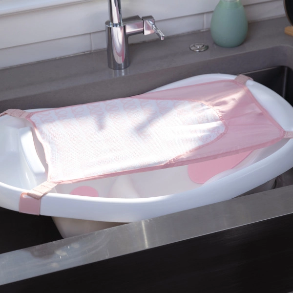 A puha, légáteresztő textil függesztő gyengéden körülöleli a babát, és szabadon hagyja a kezeit a kényelmes és biztonságos mosdatáshoz. Ideális az első hónapokban, egészen addig, amíg a gyermek önállóan nem tud ülni.