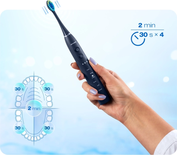 18 tisztítási kombináció az Ön igényeihez: 6 üzemmód (CLEAN, WHITE, POLISH, GUMS, SOFT, INTENSE) és 3 intenzitási szint. Az érzékeny fogaktól a mély, intenzív tisztításig – könnyedén kiválaszthatja a megfelelőt. A 2 perc utáni automatikus kikapcsolás és a 30 másodperces szakaszok megkönnyítik a száj négy kvadránsra osztását az egyenletes eredményért.