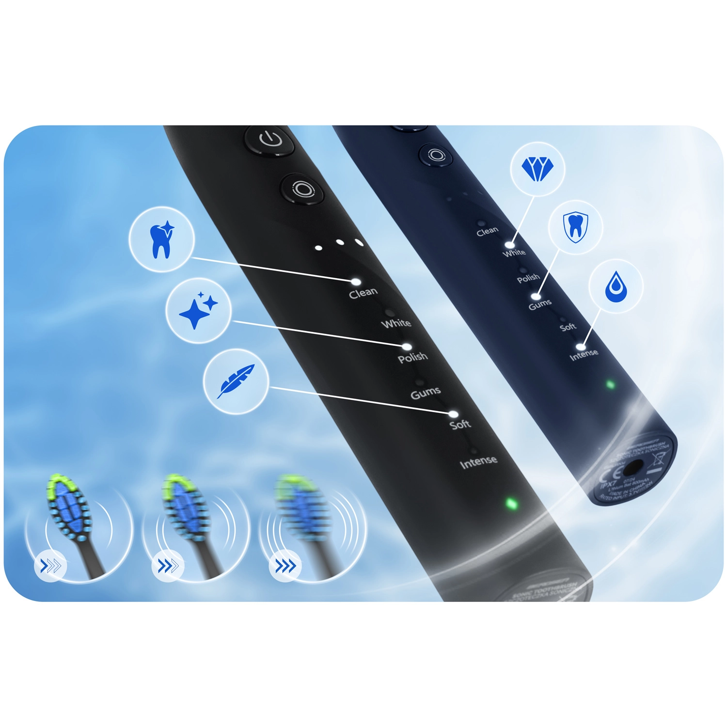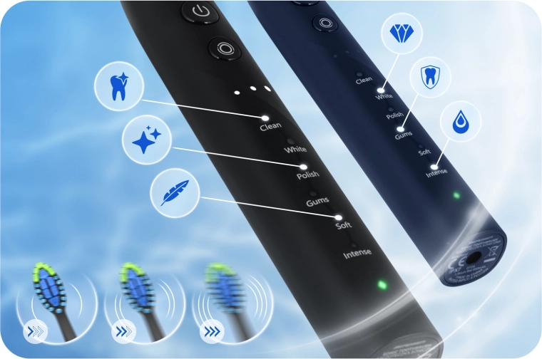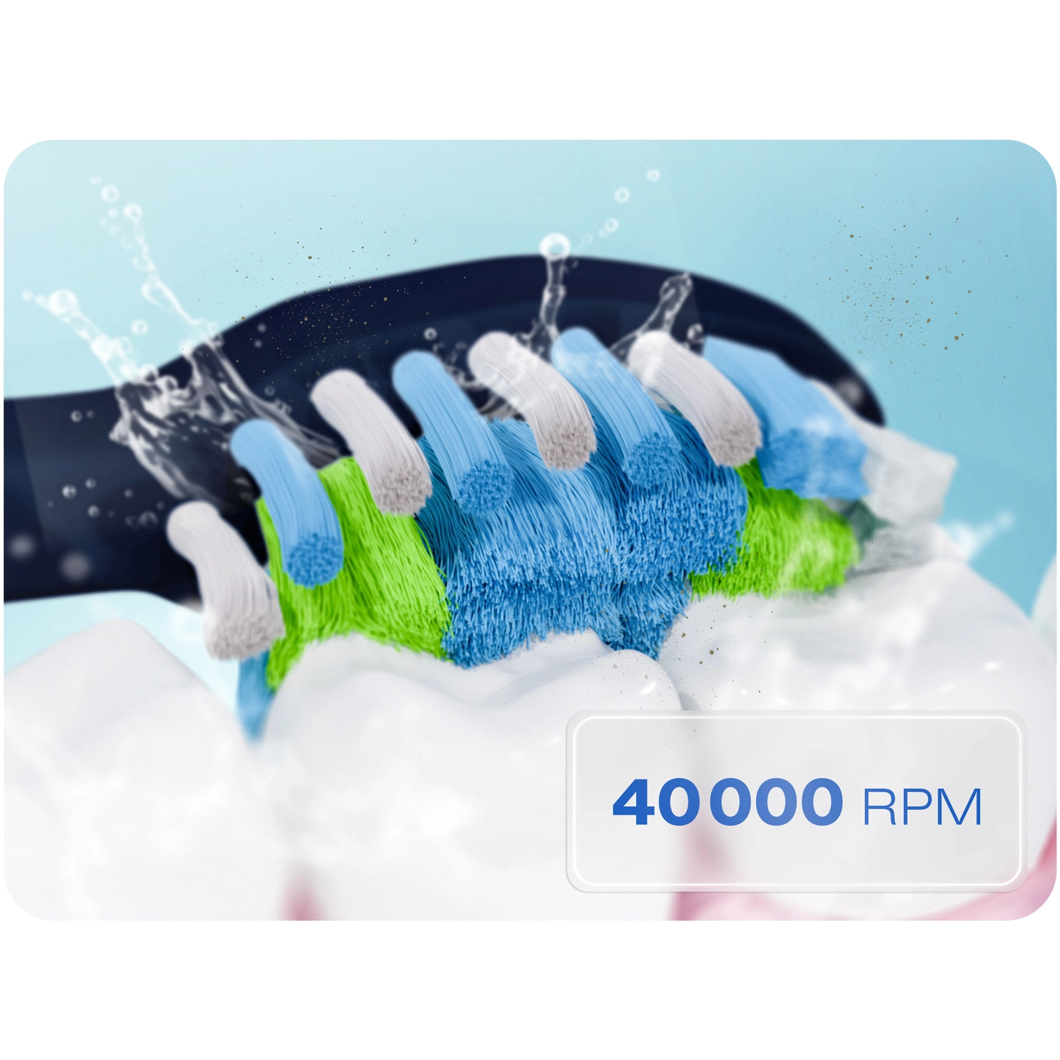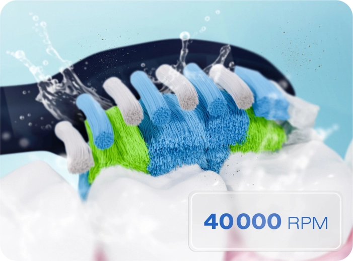 A szónikus technológia ereje gyorsan és kíméletesen távolítja el a lepedéket és az elszíneződéseket. A finom sörtéjű fejek alkalmazkodnak a fogak formájához, hátoldaluk pedig a nyelv tisztítását is megkönnyíti a hosszan tartó friss leheletért. A nagy teljesítményű motor percenként akár 40 000 rezgést generál, és az okos időzítővel együtt segít a mindennapi helyes és hatékony tisztításban.