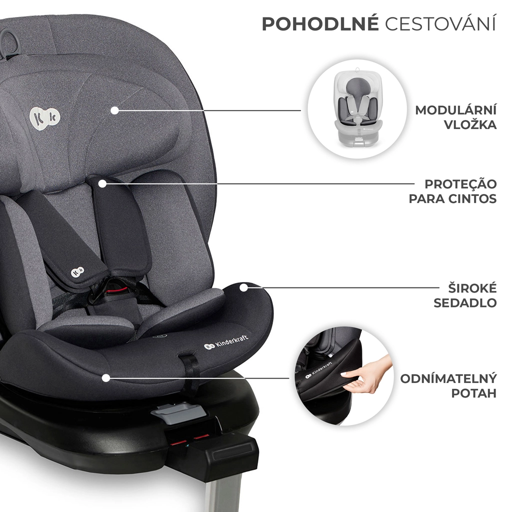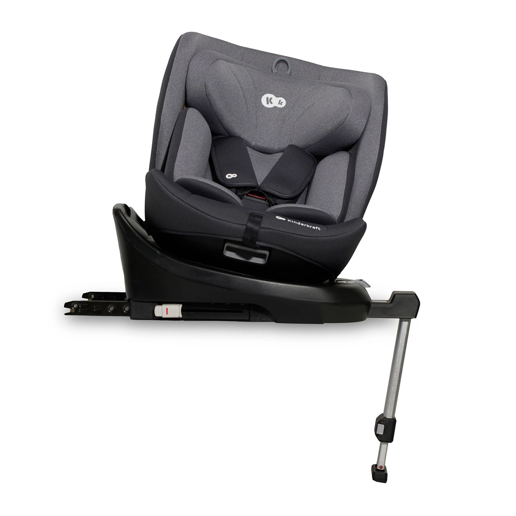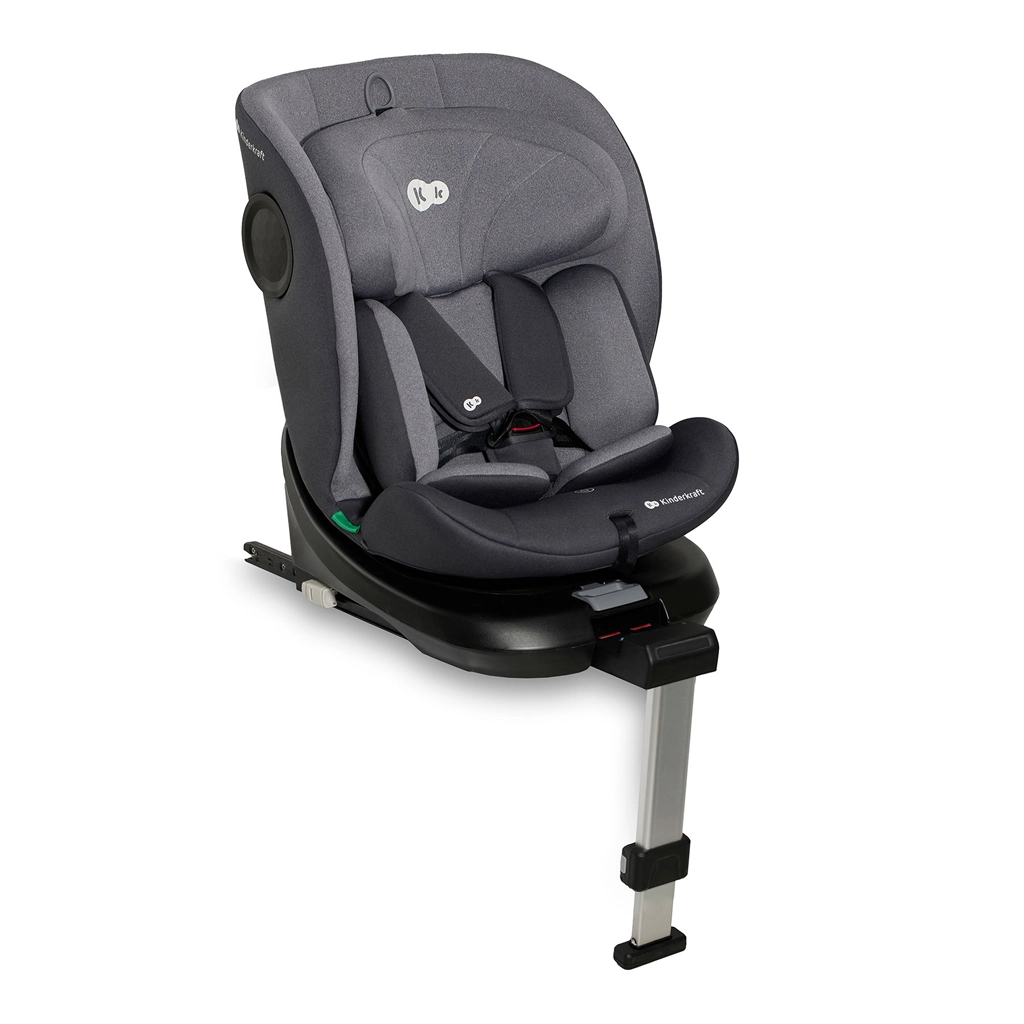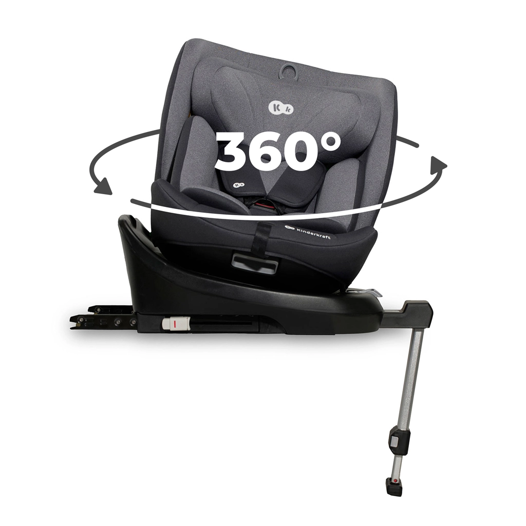 A KINDERKRAFT I-360 i-Size forgatható autósülés 40–150 cm testmagasságig maximális biztonságot és kényelmet nyújt újszülött kortól kb. 12 éves korig. Kínál hátrafelé néző (RWF) használatot 4 éves korig, 360°-os forgórendszert a könnyű behelyezéshez, ISOFIX-et helyes beszerelési jelzőkkel és támaszlábat. A védelmet fokozza a H-GUARD és a SIDE PROTECT SYSTEM+, míg a 12 fokozatú fejtámla, az 5 döntési pozíció és a memóriahabos betétek kényelmet biztosítanak minden utazáson.