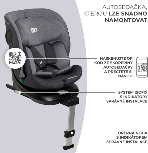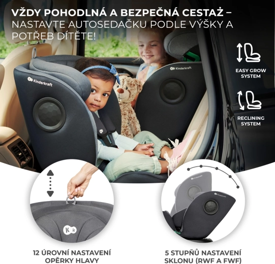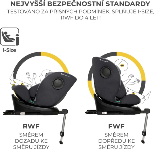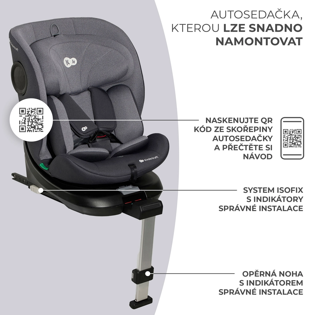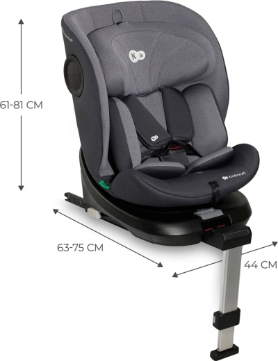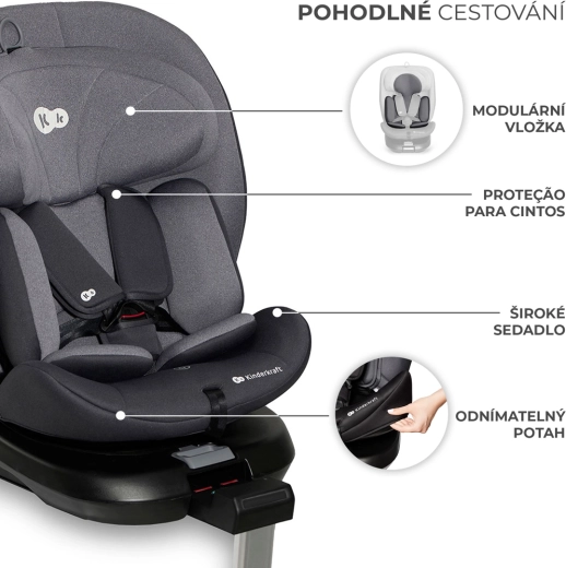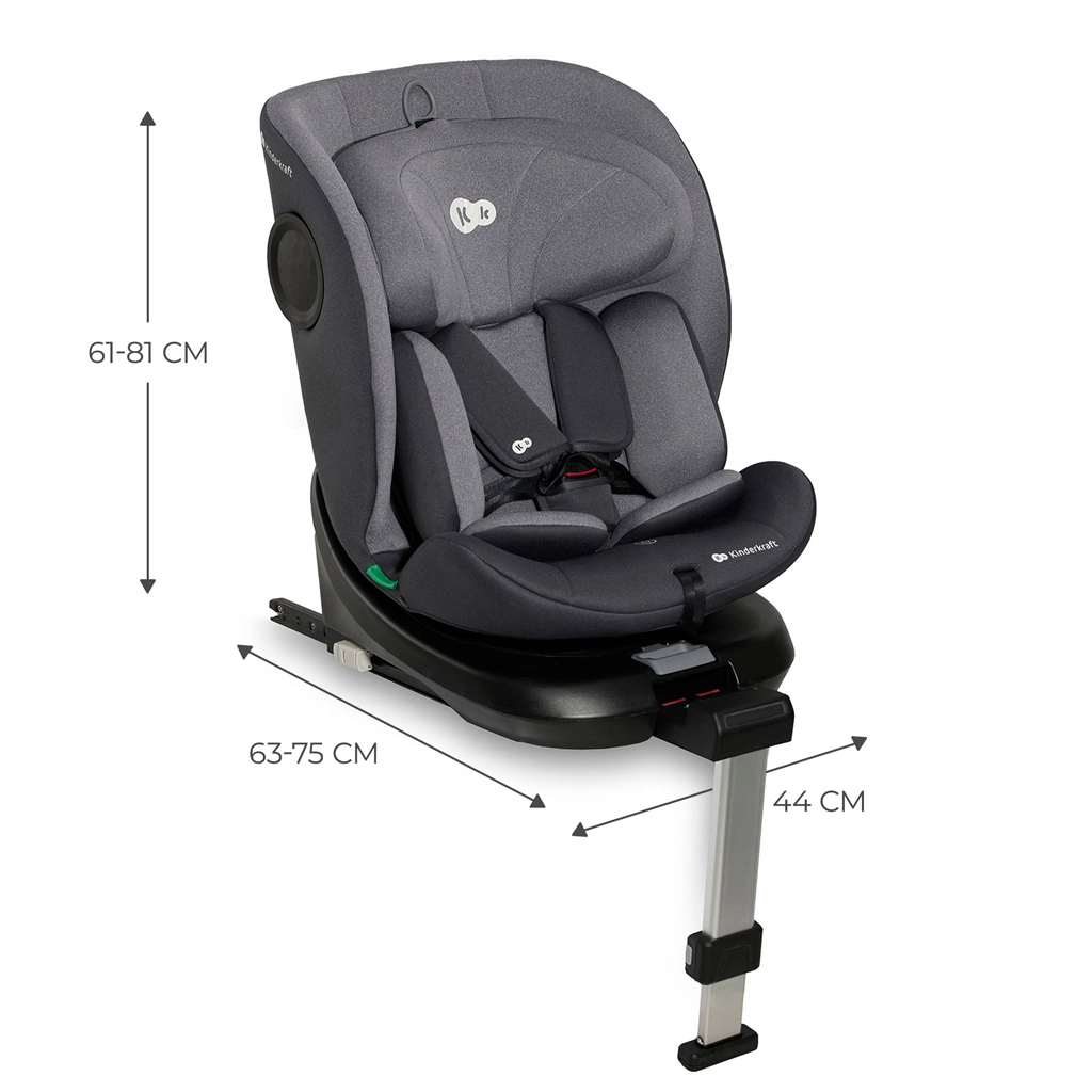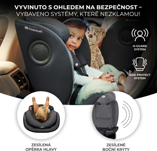 A KINDERKRAFT I-360 i-Size forgatható autósülés 40–150 cm testmagasságig maximális biztonságot és kényelmet nyújt újszülött kortól kb. 12 éves korig. Kínál hátrafelé néző (RWF) használatot 4 éves korig, 360°-os forgórendszert a könnyű behelyezéshez, ISOFIX-et helyes beszerelési jelzőkkel és támaszlábat. A védelmet fokozza a H-GUARD és a SIDE PROTECT SYSTEM+, míg a 12 fokozatú fejtámla, az 5 döntési pozíció és a memóriahabos betétek kényelmet biztosítanak minden utazáson.