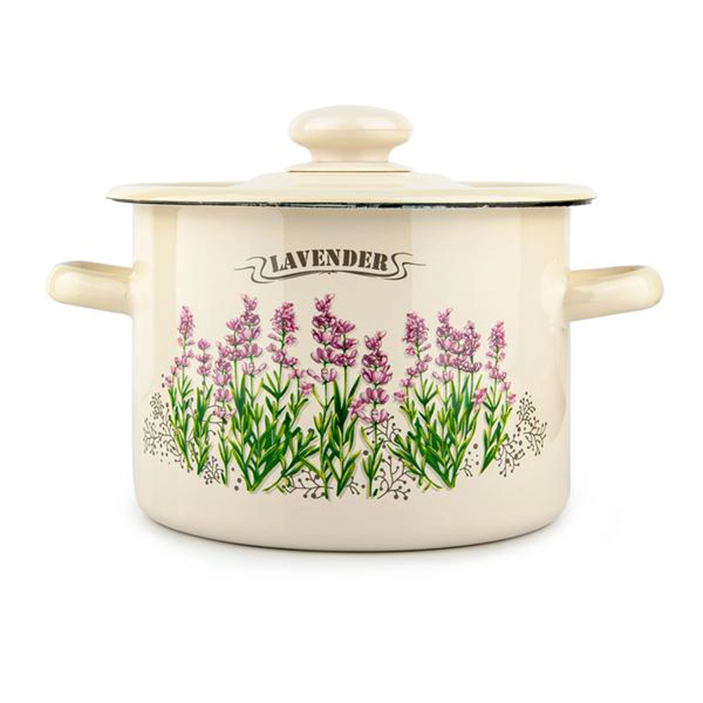 Elegáns zománcozott lábas fedővel és levendulás dekorral, ideális a mindennapi főzéshez. Minden típusú tűzhelyhez használható, beleértve az indukciósat is, űrtartalma 4,5 l, valamint praktikus fülekkel a biztonságos kezeléshez. Kiválóan alkalmas levesek, mártások és párolt ételek készítésére, és egyben feldobja konyháját mint stílusos kiegészítő.