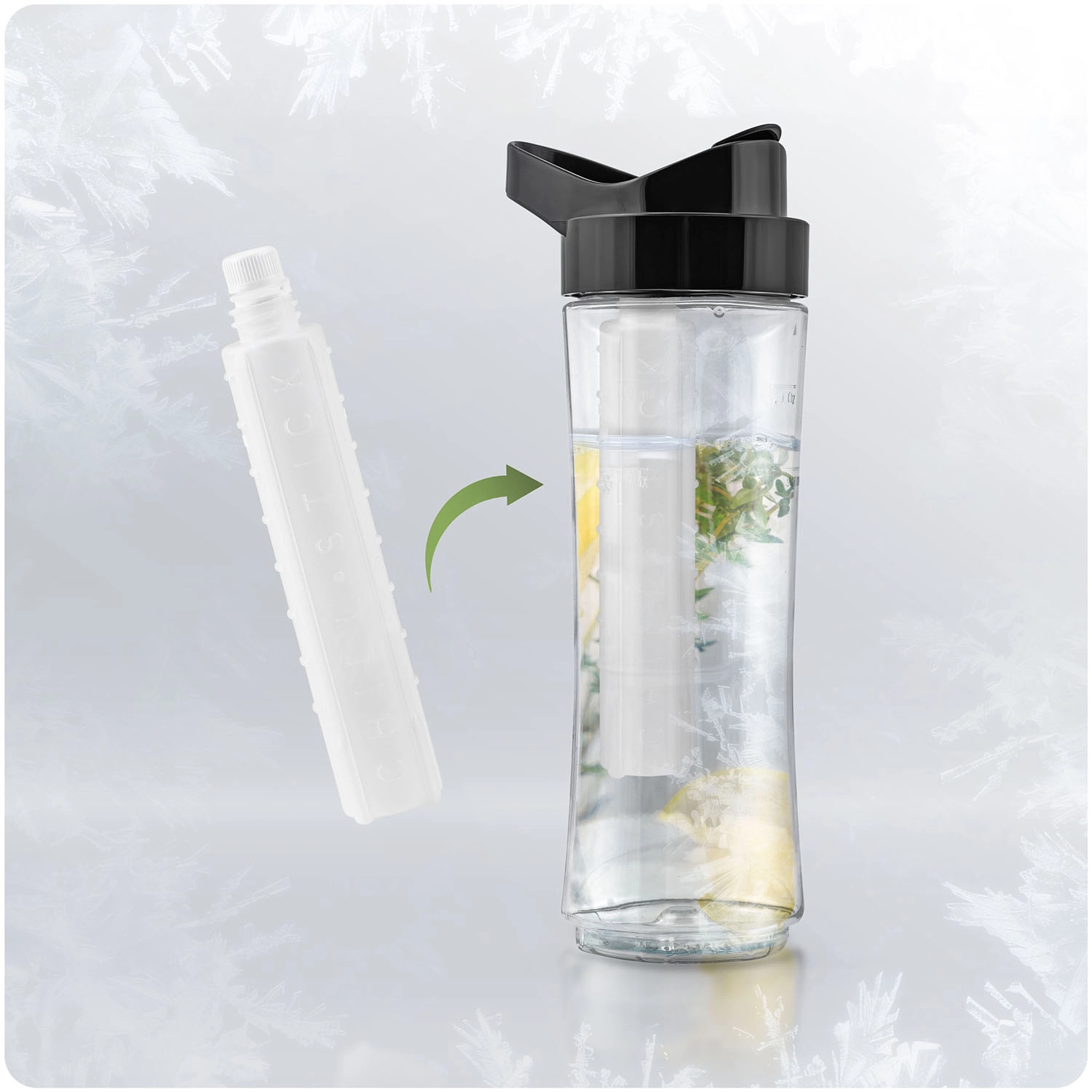 A betétet előre fagyassza le, majd csavarja a tetőbe. Az Ön smoothie-ját, turmixát vagy fehérjeturmixát órákon át kellemesen hidegen tartja.