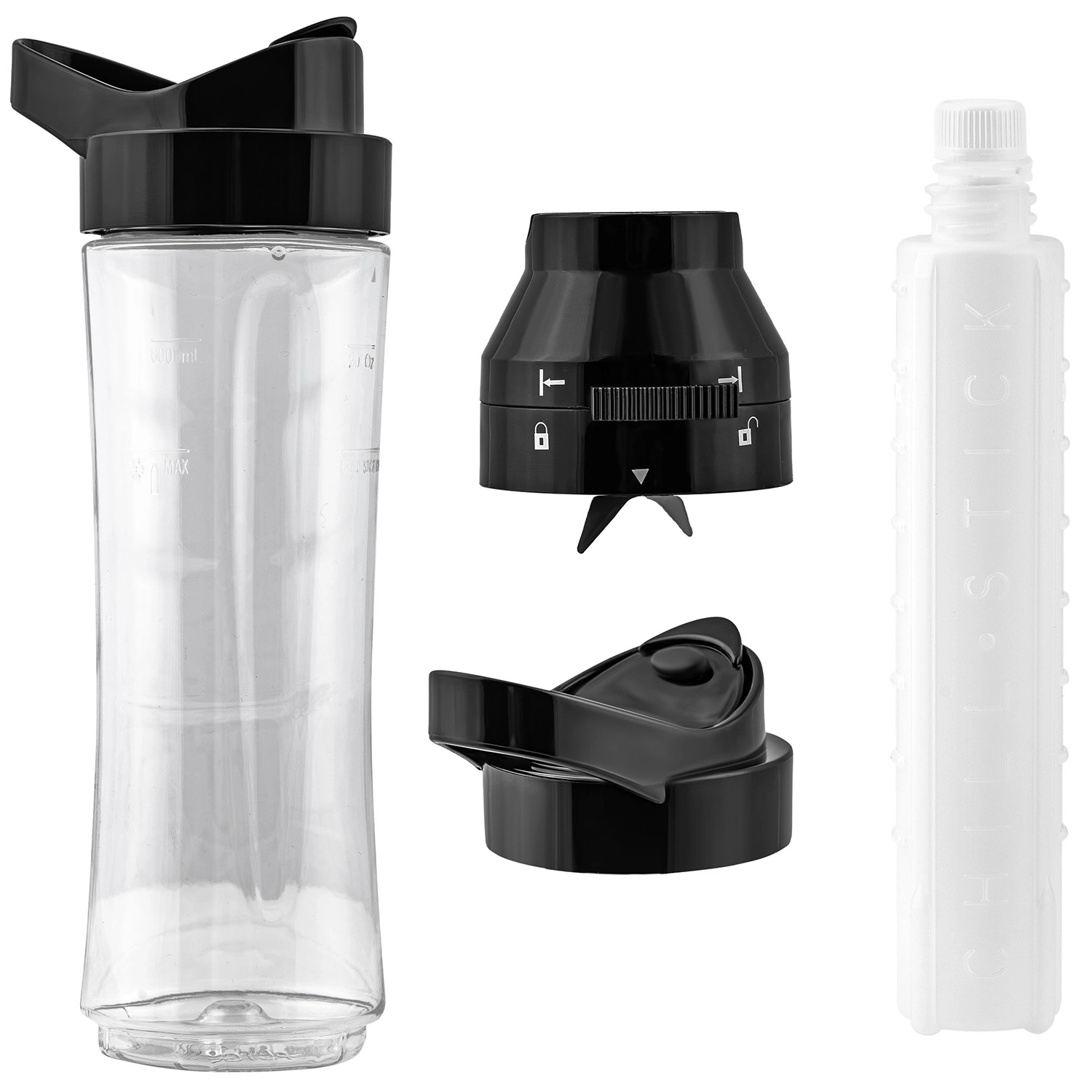 A csomag része a Chill Stick hűtőbetét, amelyet előre lefagyasztva a tetőbe lehet csavarni. Az italt több órán át hidegen tartja – ideális nyárra, munkába, iskolába és edzésre. A rozsdamentes, négyszárnyú pengék a keményebb hozzávalókat is viszik, a biztonsági retesz pedig meggátolja az indítást hibás felhelyezés esetén.