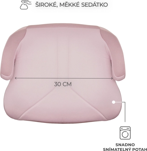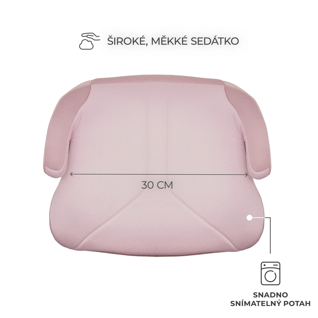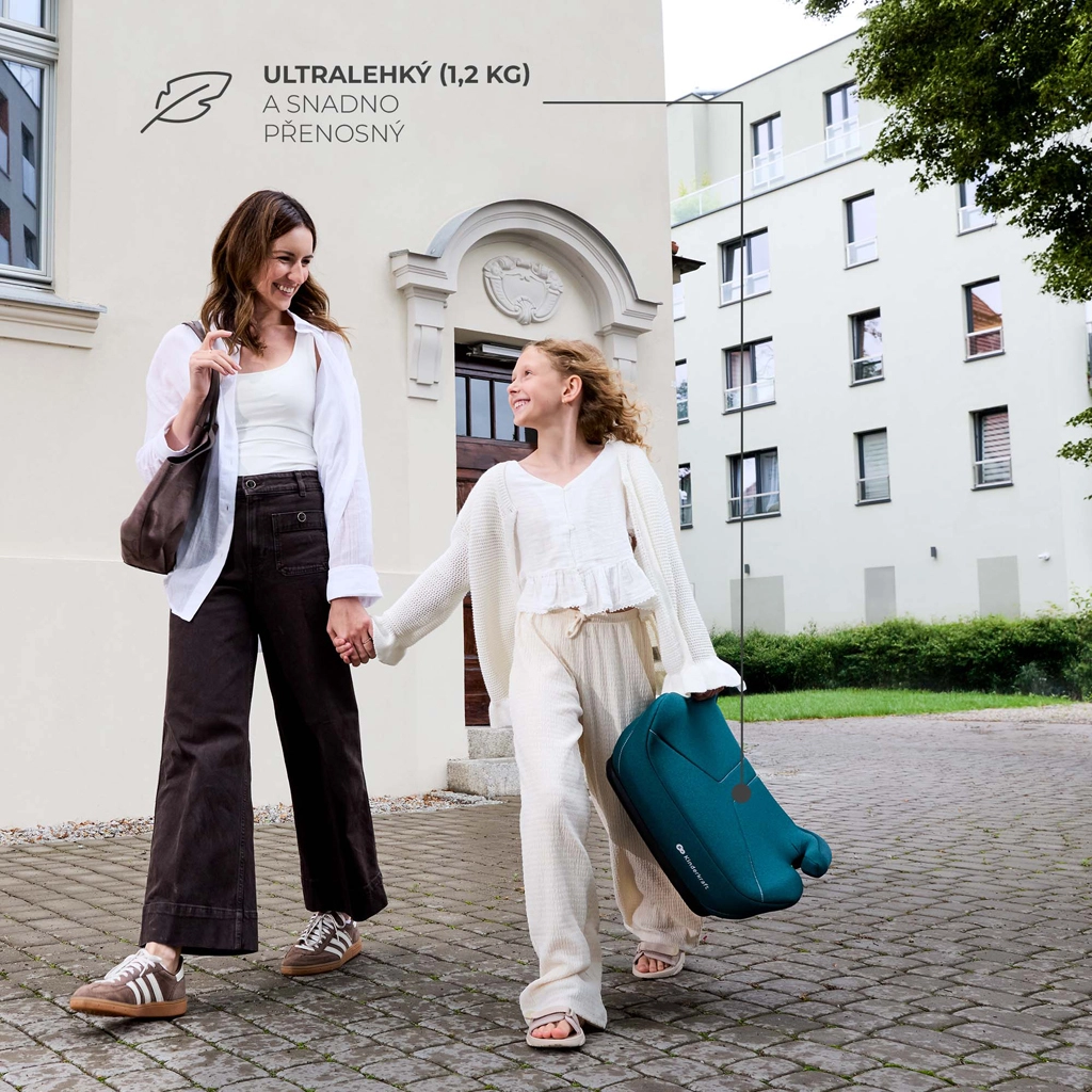 Az ülés ultrakönnyű (1,2 kg), így könnyen áthelyezhető az autók között. A beszerelés egyszerű a 3 pontos biztonsági övvel, míg a széles és puha ülőfelület kiváló minőségű habból készült a hosszabb utak kényelméért. Az ergonomikus karfák segítik az öv helyes magasságban történő vezetését, a levehető huzat pedig gépben mosható.