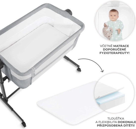 A csomag tartalmaz félkemény matracot, amelyet gyógytornászok ajánlanak – megfelelő alátámasztást nyújt a gerincnek és a fejnek, ellenáll a nedvességnek, a penésznek és az atkáknak, és mosható lepedővel érkezik. A kétfokozatú dőlés segít megfázás vagy gyakori bukás esetén. A négy, rögzíthető kerék megkönnyíti az áthelyezést a szobák között, így a kicsi mindig a közelben lehet.