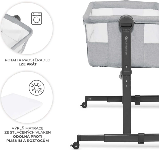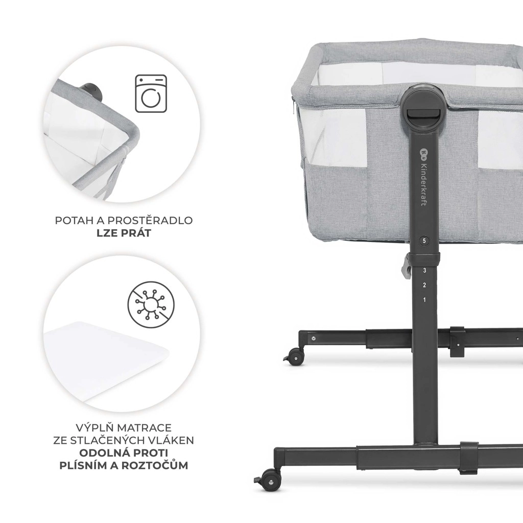 Praktikus csatlakoztatható kiságy és önálló babaágy egyben. A KINDERKRAFT NESTEE UP 2 5 magassági szintet, kétfokozatú matracdőlést, légáteresztő hálós oldalfalakat és 4 fékezhető kereket kínál a lakáson belüli könnyű mozgatáshoz. A csomag tartalmaz félkemény matracot lepedővel az újszülöttek egészséges és biztonságos alvásához.