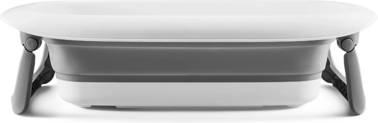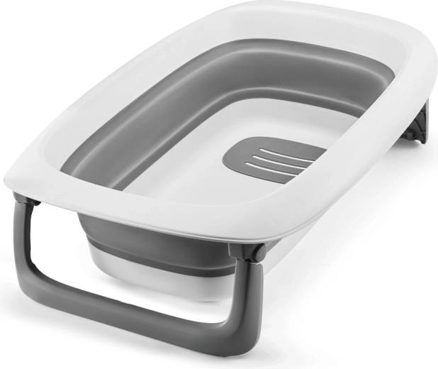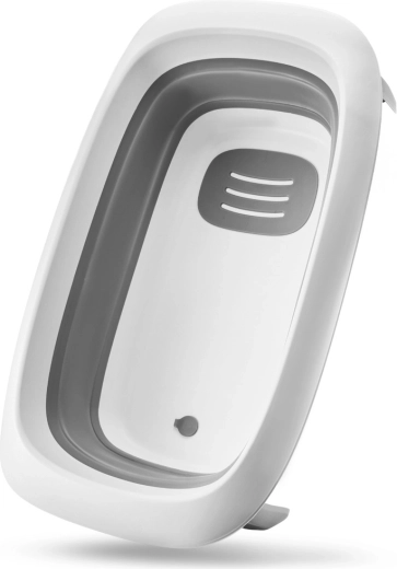 A szilikon aljú kád néhány másodperc alatt laposra csukható. Remek választás kis fürdőszobákba, utazáshoz és a fürdetés utáni egyszerű tároláshoz.