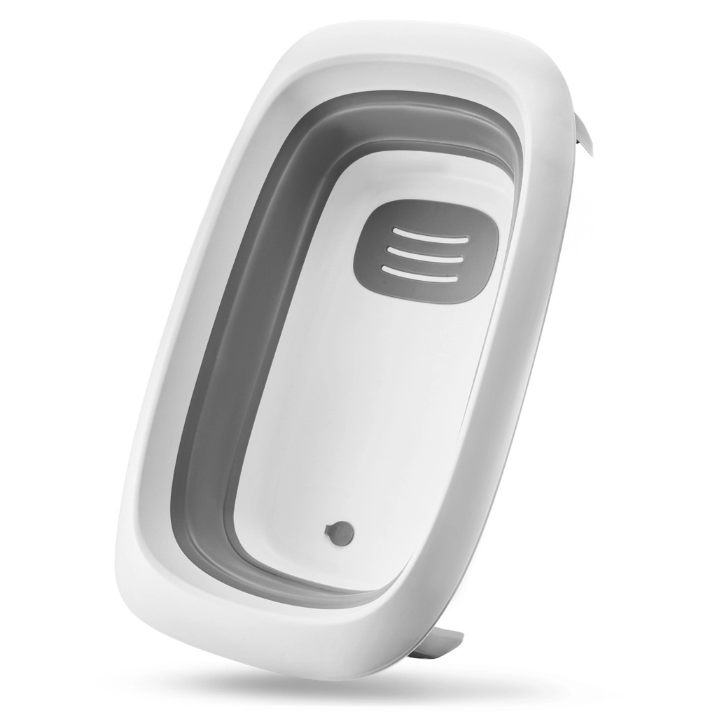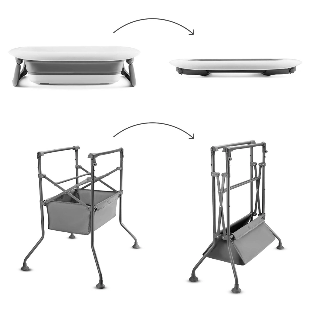 A szilikon aljú kád pillanatok alatt laposra csukható – tökéletes kis fürdőszobákhoz és utazáshoz. A hosszú leeresztőcső (151 cm) lehetővé teszi a víz egyszerű leengedését közvetlenül a mosdóba vagy a kádba, a nehéz kád emelgetése nélkül. Az átlátható rendszerezés magától értetődő: a praktikus kosárban a kozmetikumok, törölközők és játékok mindig kéznél vannak.