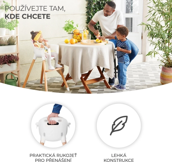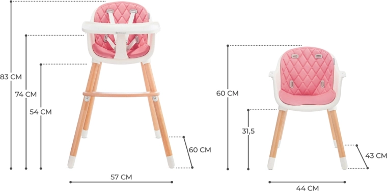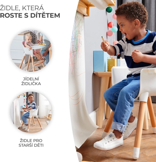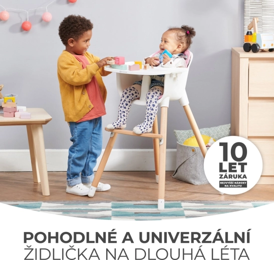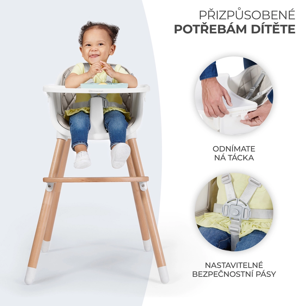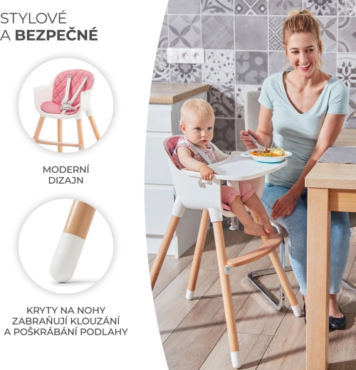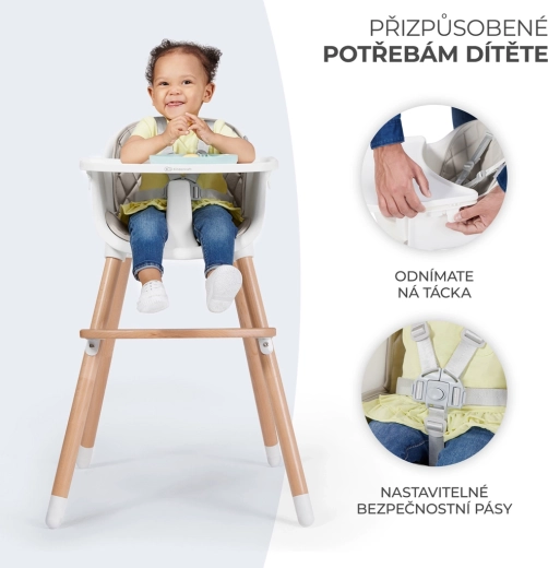 Praktikus és stílusos 2 az 1-ben etetőszék, amely együtt nő gyermekével – magas etetőszék és alacsony szék nagyobb gyerekeknek (20 kg-ig). Könnyen tisztítható a levehető tálcának és a műanyag ülőrésznek köszönhetően, kényelmes lábtartót kínál, a biztonságot pedig az 5 pontos övek és a lábakon lévő csúszásgátló végek biztosítják.