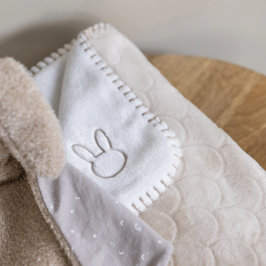A NATTOU kétoldalas takaró homok/fehér kombinációban a baba mindennapi kényelmére készült. A puha felület kíméletes az érzékeny bababőrhöz, meleg struktúrája pedig otthon és útközben is egyenletes meleget biztosít. A két eltérő oldalnak köszönhetően könnyedén összehangolhatja a takarót a babakocsi vagy a gyerekszoba felszerelésével.