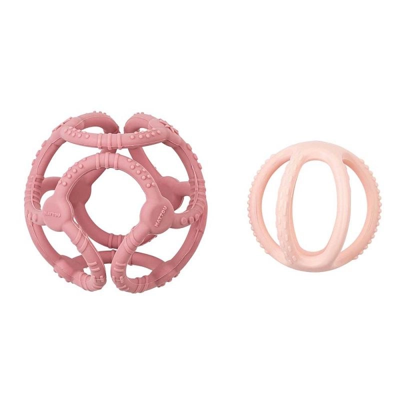 Praktikus és aranyos szilikon rágóka két összekapcsolt labda formájában, amely megkönnyebbülést nyújt a fogzás idején és támogatja az érzékszervi fejlődést. A puha, BPA-mentes szilikonnak, a strukturált felületnek a finom ínymasszázshoz és a könnyű megfogásnak köszönhetően ideális a mindennapi játékhoz otthon és útközben is.