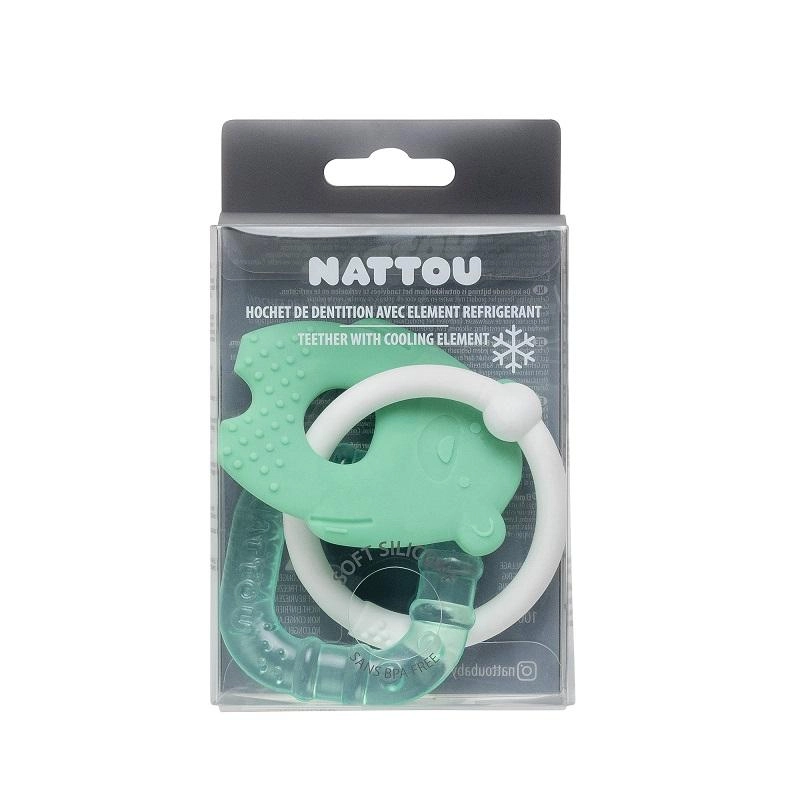 Nyújtson megnyugvást és enyhülést babájának a zöld macival díszített NATTOU rágókával. A hűsítő gyűrű használat előtt hűtőbe tehető, így rágás közben természetes módon csillapítja az irritált ínyt. Az ergonomikus forma és a könnyű kialakítás a legkisebbek számára is megkönnyíti a fogást.