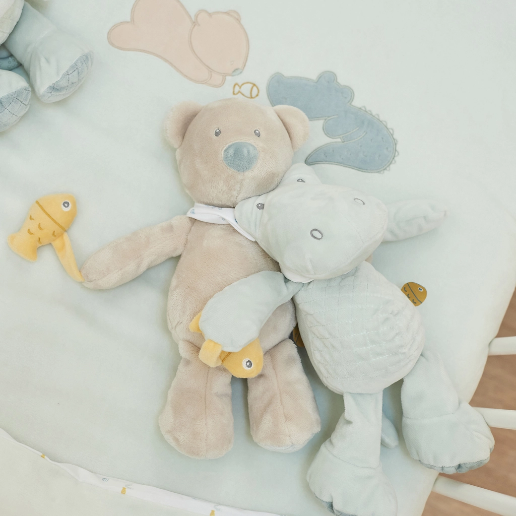 - Érzékelés és motorika támogatása – a fülek, farok, kendő és a halacska ösztönöznek a megfogásra és felfedezésre.