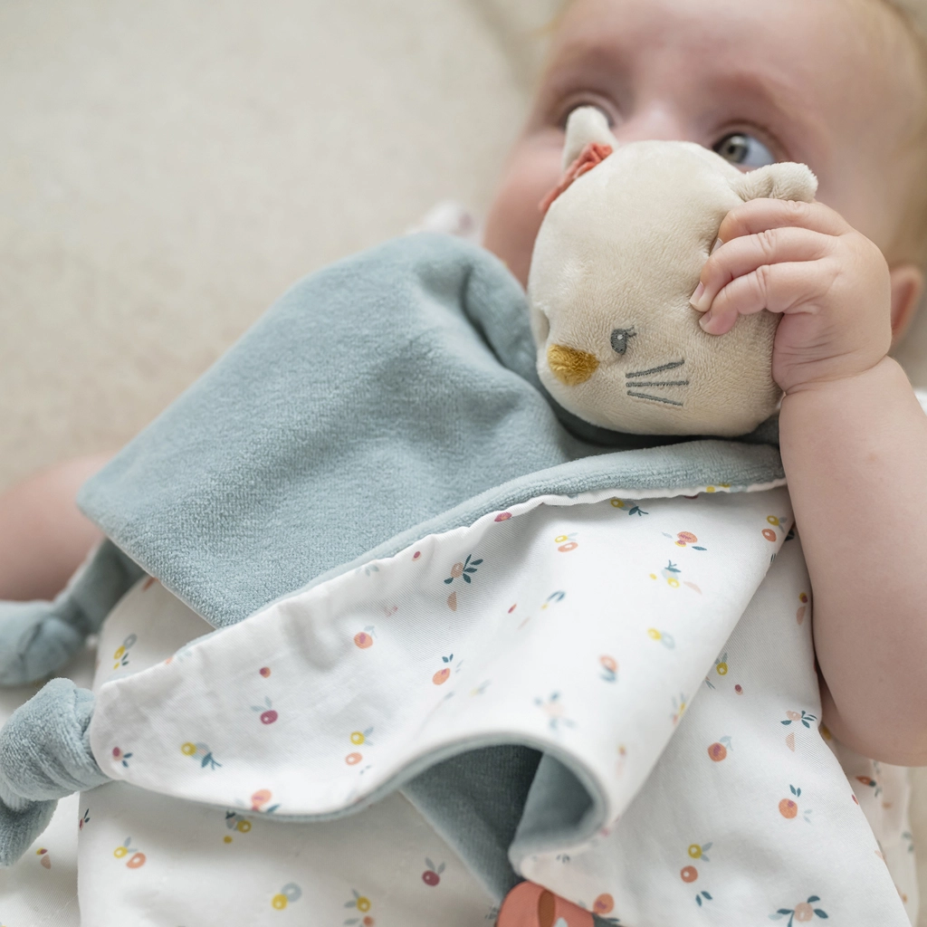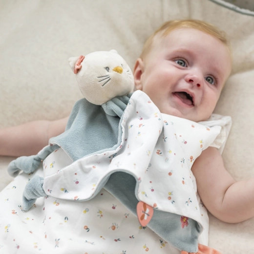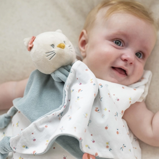 A bájos Lana cica rongyi a NATTOU-tól úgy készült, hogy kényelmet és biztonságérzetet adjon a babának. A puha poliészter–pamut kombináció kellemes tapintást nyújt, míg a sarkokon lévő csomók és a textilcímkék felfedezésre hívnak, támogatva a finom- és nagymotoros készségeket. A praktikus cumirögzítő gondoskodik róla, hogy a kedvenc cumi mindig a közelben legyen.