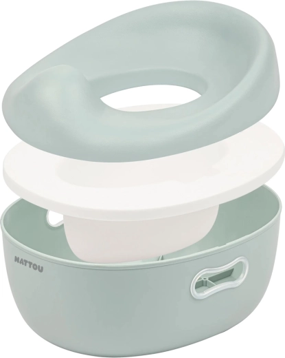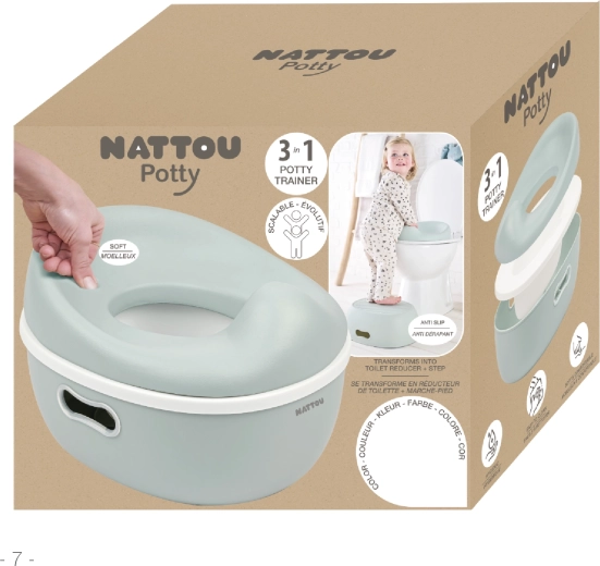 A NATTOU Potty 3 az 1-ben bili okos megoldás a szobatisztaság tanulásának minden szakaszára. Kezdetben kompakt bili kényelmes üléssel és megemelt első résszel a fröccsenés ellen. Amikor a gyermek készen áll, egyszerűen használható szűkítőként a hagyományos WC-hez, valamint fellépőként, amely megadja a szükséges magasságot és stabilitást.