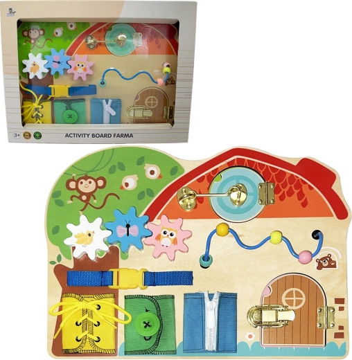 A vidám farm motívumokkal díszített aktív tábla játékos tanulást kínál a gyerekeknek. Az állatok, a gazdasági eszközök és a különféle interaktív elemek felfedezésre hívnak, edzik az ujjacskákat és támogatják a koncentrációt. A masszív fa megmunkálás kellemes tapintású és ellenáll a mindennapos használatnak.