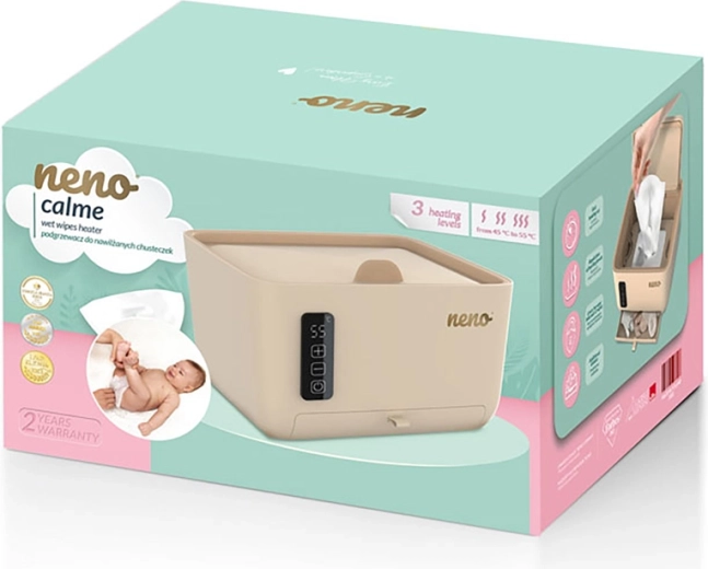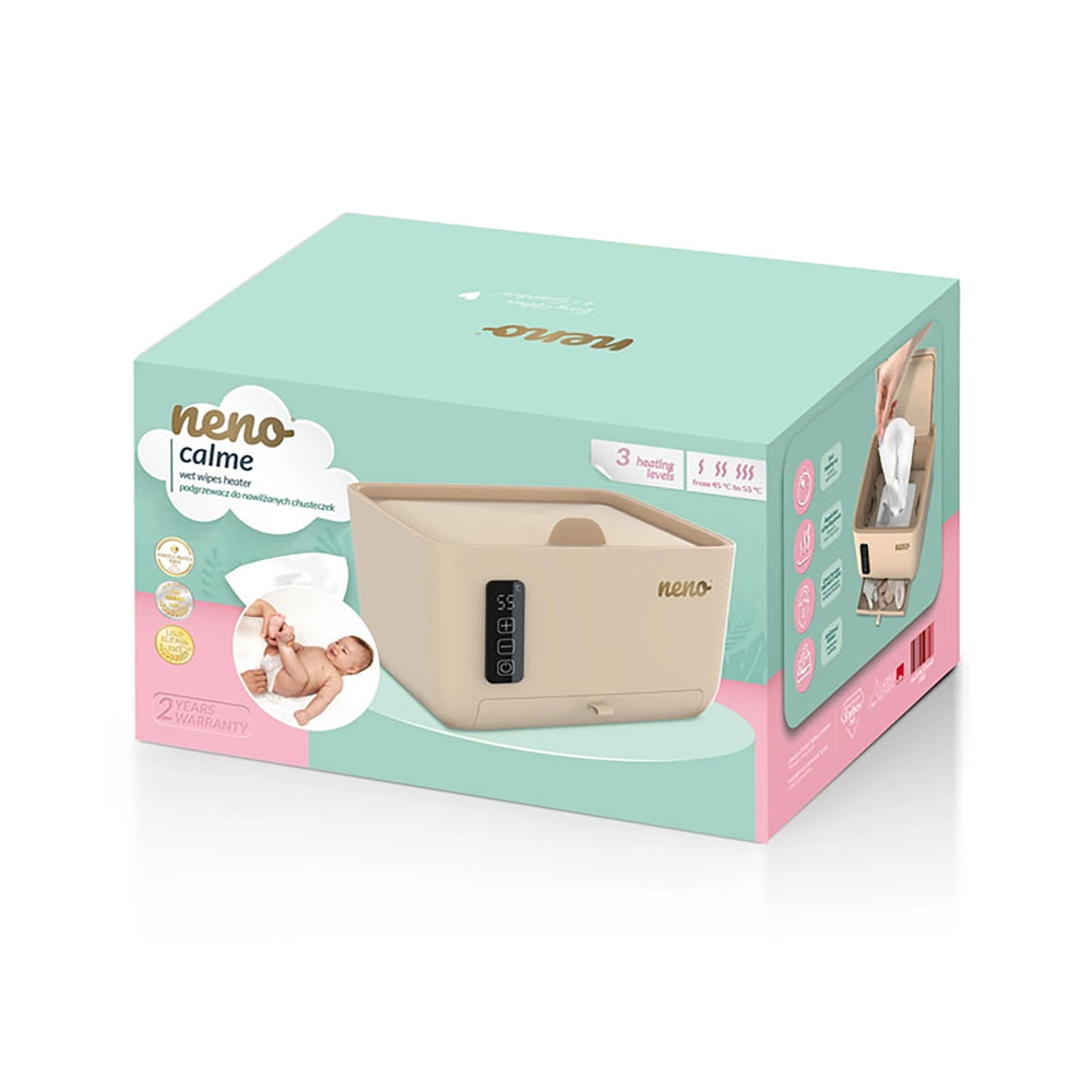 A Neno Calme modern törlőkendő-melegítő és -tartó, amely növeli a kényelmet a babaápolás során. A három fűtési fokozatnak (45/50/55 °C) és a kétoldali melegítésnek köszönhetően felülről és alulról is egyenletes, kellemes hőmérsékletet biztosít a törlőkendőknek, túlmelegedés vagy kiszáradás kockázata nélkül. A tömítéssel ellátott mágneses fedél energiát takarít meg és segít megőrizni a nedvességet belül.