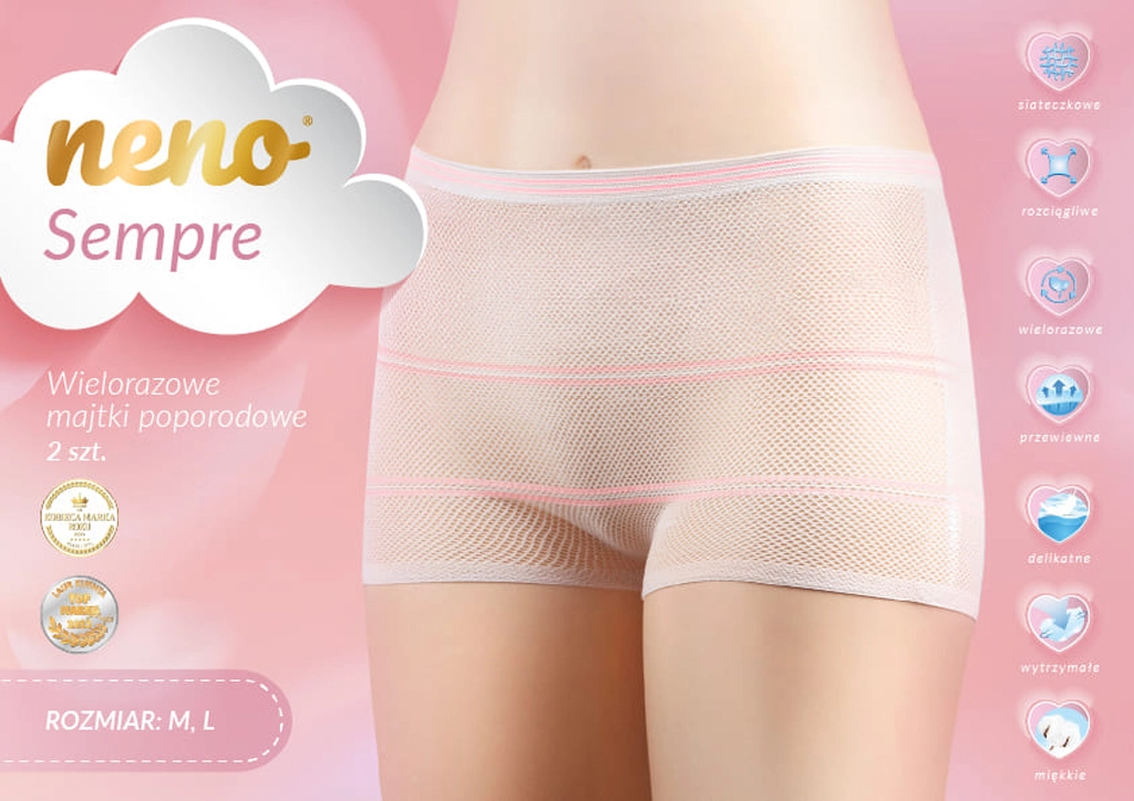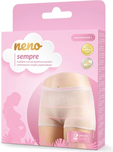 A Neno Sempre szülés utáni bugyi légáteresztő, varrás nélküli és könnyedén rugalmas, így a gyermekágyi időszakban mindennapi kényelmet nyújt. Megbízhatóan tartja a szülés utáni betéteket, magas dereka kíméletesen fedi a császármetszés hegvonalát, és többször felhasználható, környezetbarátabb alternatívát kínálva az eldobható bugyikkal szemben.