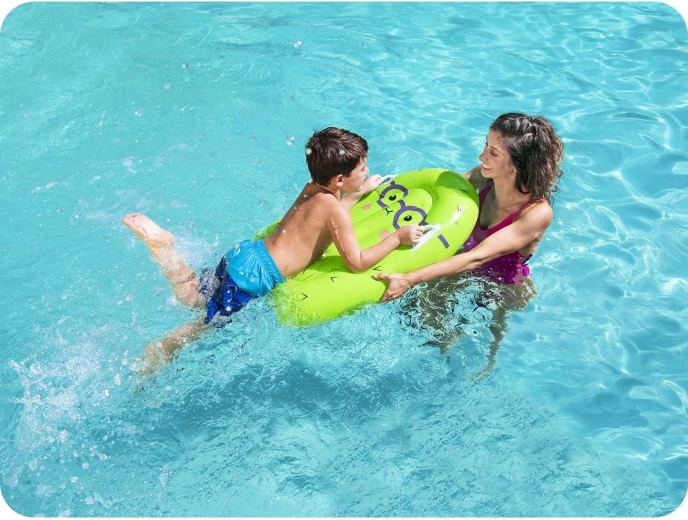 Ez a könnyű és könnyen hordozható felfújható deszka ideális a medencébe és nyaraláshoz is. A színes kivi, ananász vagy eper minták örömet okoznak a gyerekeknek és magukra vonják a figyelmet, míg a két strapabíró fogantyú segít egyensúlyban maradni és magabiztosságot ad úszás közben.