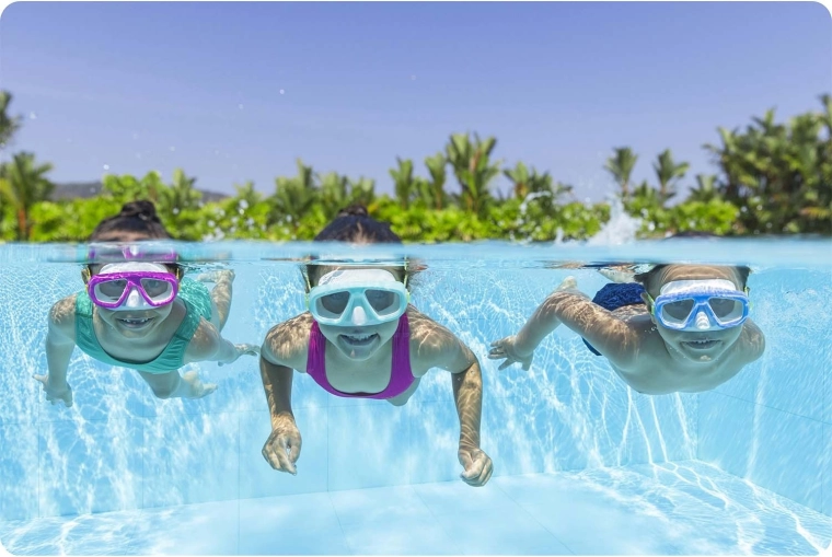 A tiszta polikarbonát lencsék széles látómezőt és magas karcállóságot kínálnak – ideálisak medencébe és tengerre egyaránt.