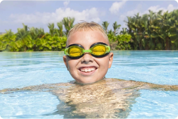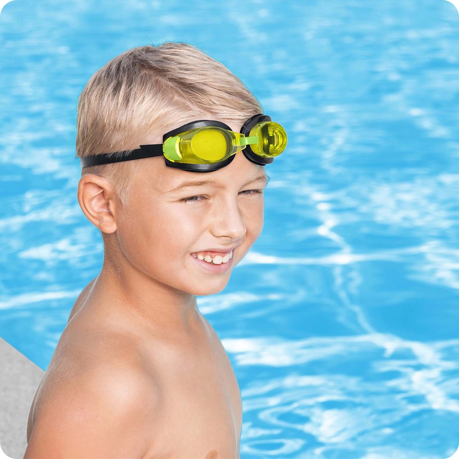 Megbízható gyerek úszószemüveget keres medencébe és szabadtéri fürdőzéshez? Ez a BESTWAY szemüveg sárgás árnyalatú lencsékkel védi a szemeket a víztől és a napsütéstől, míg a puha tömítés és az állítható szilikonpánt biztos és kényelmes illeszkedést nyújt. Ideális 7 éves kortól edzéshez, játékhoz és az első úszó mozdulatokhoz.