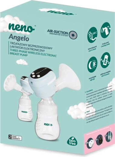 A Neno Angelo vezeték nélküli mellszívó 3 hatékony szívási fázist kínál (stimuláló, mély és kevert Let-down) mindegyikben 9 intenzitási szinttel. Csendes, könnyű és hordozható, érintőkijelzővel, éjszakai használathoz LED háttérvilágítással és visszafolyás elleni védelemmel rendelkezik. A puha szilikon betét kíméletes a bőrhöz, az eszköz pedig BPA-mentes.