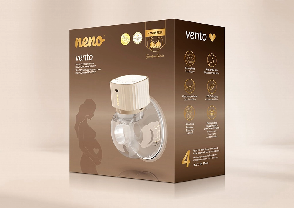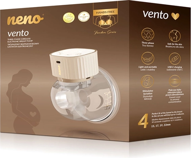 A Neno Vento modern, elektromos, hordható mellszívó, amelyet a szabad mozgás és a kényelem érdekében terveztek. Közvetlenül a melltartóban ül, teljesen vezeték nélkül működik, és csendes járásának köszönhetően diszkrét fejést tesz lehetővé a nap bármely szakában. A háromfázisú szívástechnológia – stimulálás, mély fejés és kombinált mód – a természetes szoptatást utánozza, és segít hatékonyan beindítani és fenntartani a laktációt.