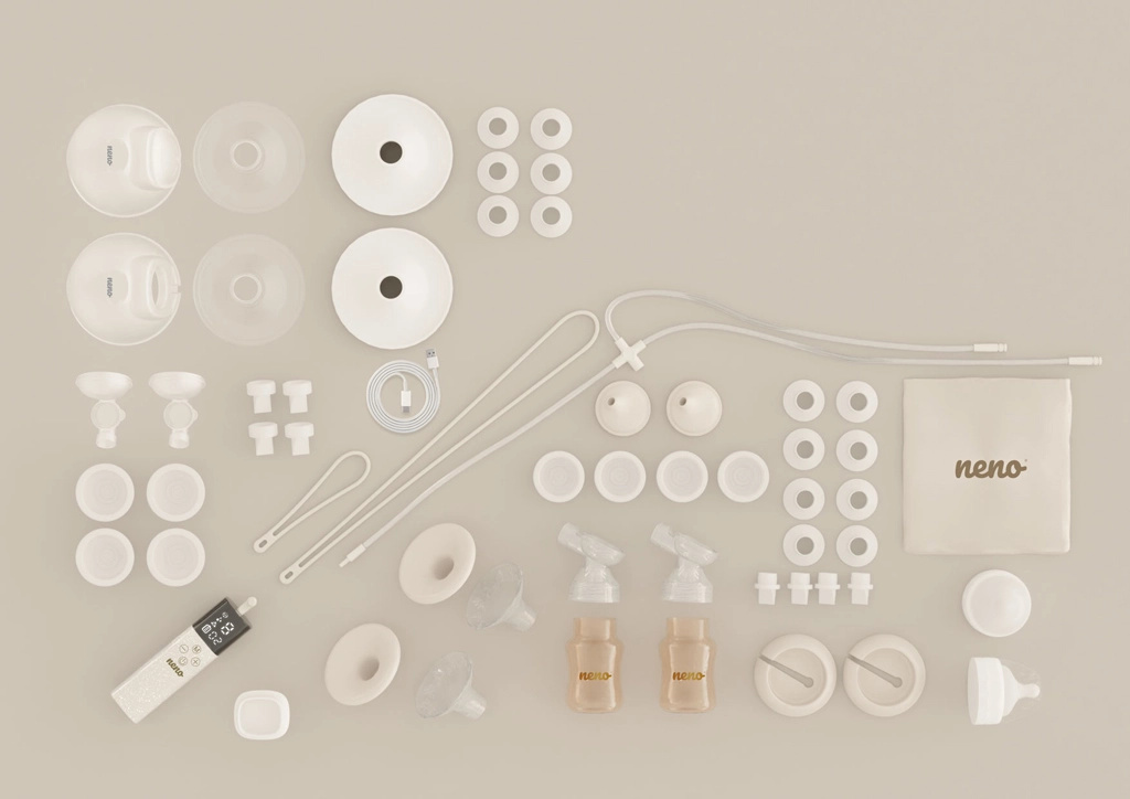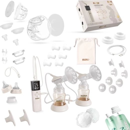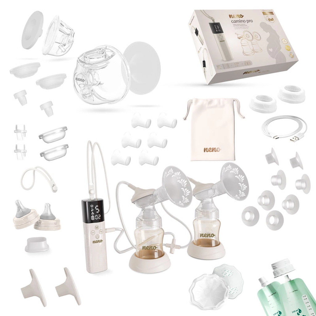 - Neno Camino Pro mellszívó, állvány, USB‑C kábel, bársonytok, 2× tejtároló zacskó, 2× melltartóbetét, 2× nyakpánt (hosszú és rövid); üveges fejőkészlet (2× 150 ml-es üveg, 2× tölcsérfedél, 2× 24 mm-es tölcsér, 2× tartó, szilikon cső, 4× membrán, 4× szelep, 2× csatlakozó, 2× szűkítőkészlet 15/17/19/22 mm, 2× üvegzár csatlakozóval); hands‑free gyűjtőkészlet (2× 240 ml-es tartály, 2× csatlakozó, 2× membránfedél, 4× membrán, 2× 24 mm-es tölcsér, 4× szelep, 2× tölcsérfedél, 2× szűkítőkészlet 17/19/21 mm)