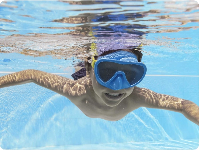 A tartós lencse tiszta képet ad a víz alatt, és védi a szemet a napsütéstől – ideális medencébe és tengerre is.